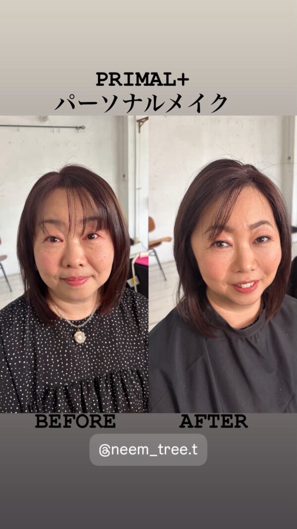 PRIMAL+のパーソナルメイクでは、骨格・肌の色味・お顔全体のバランスを見ながら、その方の魅力を最大限に引き出すメイクをご提案しています。