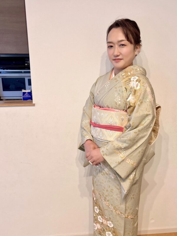 今回お召しになったのは、淡いセージグリーンに花柄があしらわれた上品な訪問着。